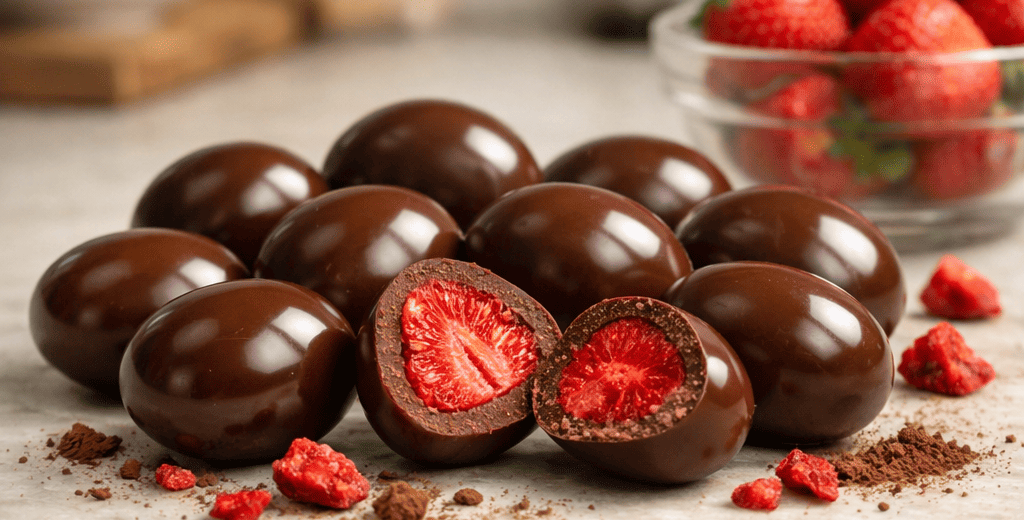Freeze-Dried Strawberry Dragees Coated in Dark Chocolate